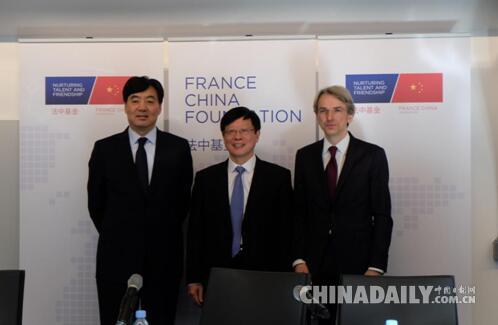 中国驻法国大使翟隽(左),中投公司董事长丁学东(中),法国外交部亚大司司长、法中基金会共同创始人卢力捷(右)。(图片来源:中国日报实习记者 唐书悦)